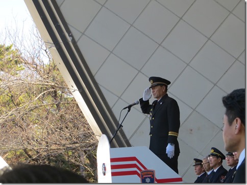 今日は平塚市消防出初式が総合公園で行われました。開式の辞を消防団長から。