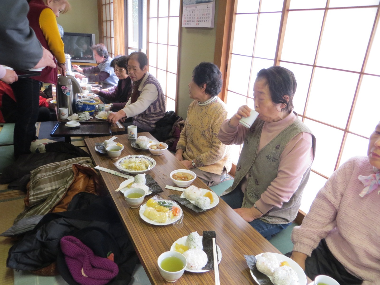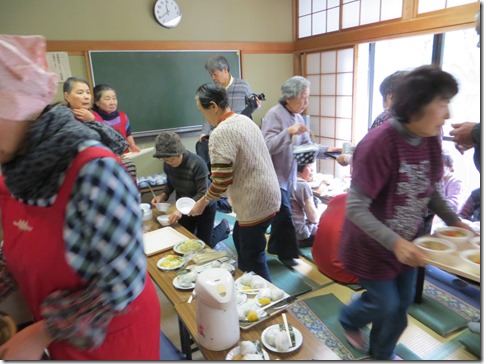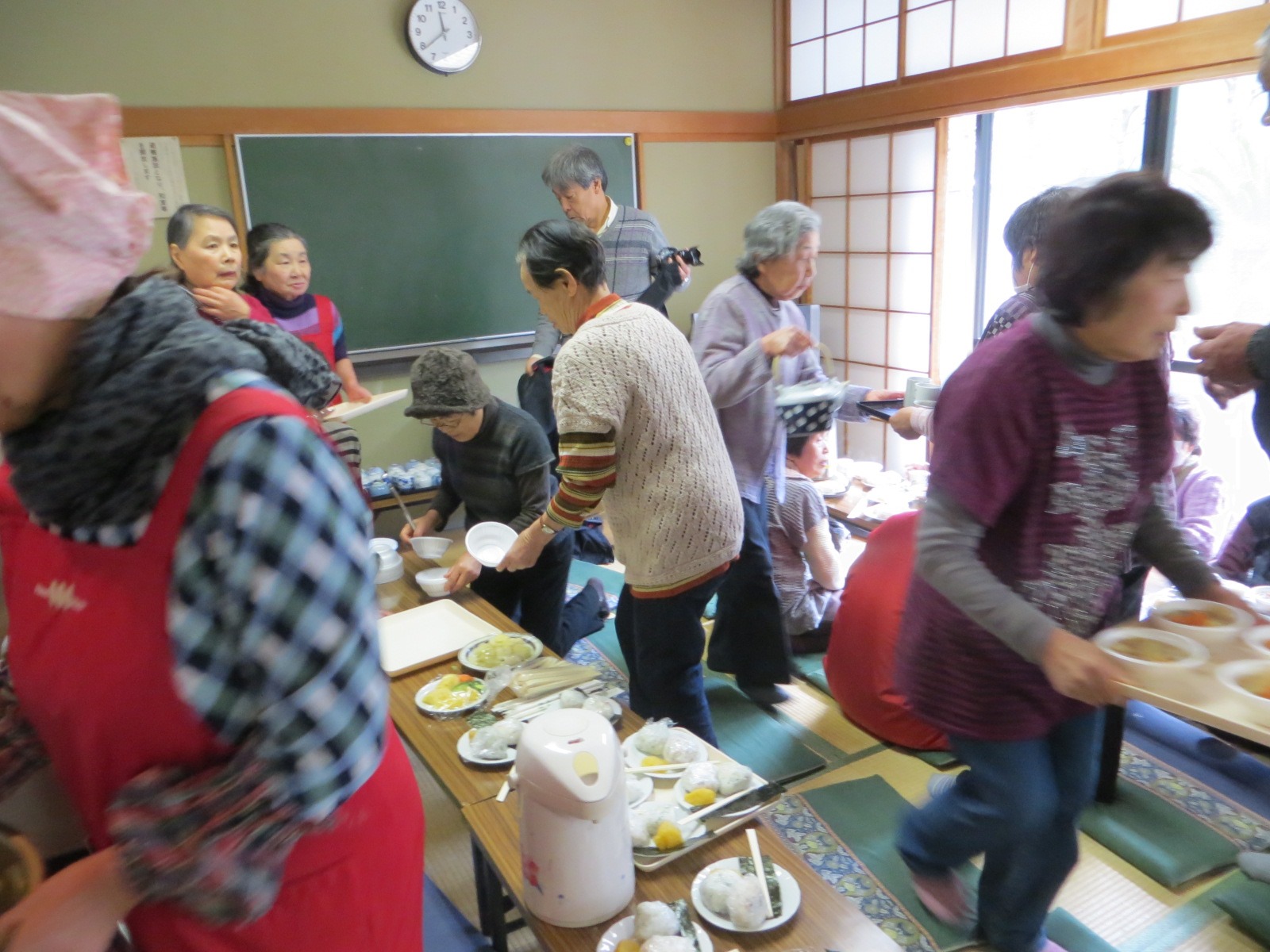 大勢のため、目の前にある金田公民館の和室が用意されていて、そちらでは、ボランティアの方々が朝からおにぎりやあったかい豚汁を作って帰りを待っていました。