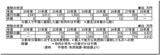 平成27年度に平塚市に入ってきた寄附金は13件で559万円。しかし、市民がふるさと納税として寄附をした額は、なんと2億1,214万3千円(市民税課資料)です。その寄附金に対する控除額は翌年の平成28年度に9,437万円。つまり、市への寄附は559万円ですが、市民に寄附金控除として約1億円が出て行った(言葉が正しくないですが)ことになります。