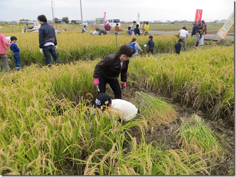 さっそく、皆田んぼに入って稲刈りが始まりました。
