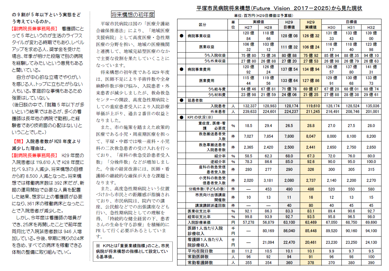 H29年度の実績をどう見るかという点では、「平塚市民病院 Future Vision 2017ー2025」に掲げた将来構想の目標値から見た評価と、昨年度までの実績と照らしてどうかという評価の2つで見ていくことになります。