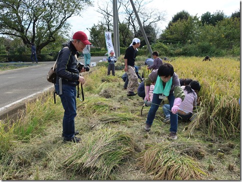 午後は花アグリでやっている「米づくり体験隊」の稲刈りでした。午前中は露があるため、毎年「稲刈り」は午後と決まっているのです。わが家は夫と孫と嫁さんの4人で参加。子どもたちの一番の関心は「お米(モミになったもの)」がどんどん貯っていく様を見ることでした(^◇^)。自分たちが苗を植え、田の草取りをしてようやく収穫したそのお米が貯まるのを群がるように見ていました。