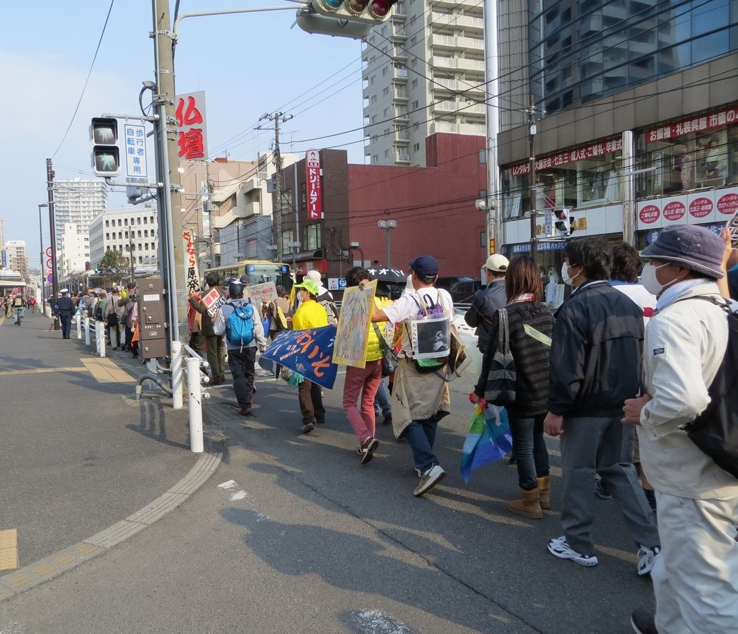 途中から列に加わった人、家族で沿道に出て待っていて手を振ってくれた人、車からにっこりとうなづいてくれる人・・。「くり返してはならない」の思いは一緒だということを確認できたひと時でした。