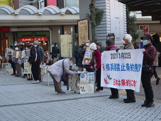 何十年もの間「核兵器廃絶」を訴え続け、毎月、広島・長崎に原爆が投下された6日と9日に駅頭で「核兵器廃絶を求める国際署名」に取り組んできた新日本婦人の会や平和委員会の方々の活動を思い起こし、感慨深い思いで駅頭に立ちました。世界が核兵器禁止で動き出した、正に「お祝い」の日です。