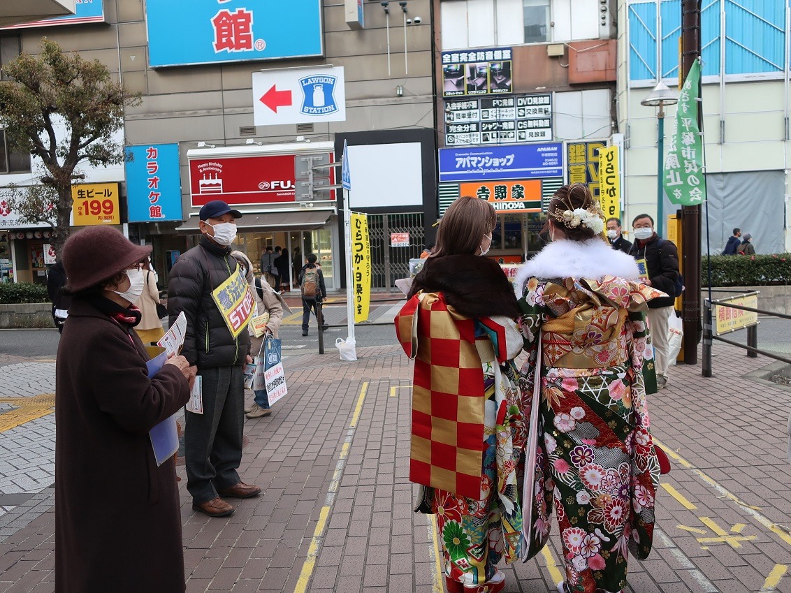 私は「ひらつか・9条の会」や「秘密保護法廃止をめざす平塚市民の会」の方々とともに、「成人おめでとう」と新たに成人になられた若者に向けたチラシをお配りしました。ところが、分散しての開催であり、しかも会場の前ではなく、駅のそばでやっていたため、時間の設定が悪かったのか、新成人に渡せたのはほんのわずか。多くが、「一般の人にもお配りして運動の趣旨を理解していただこう」ということに・・・。