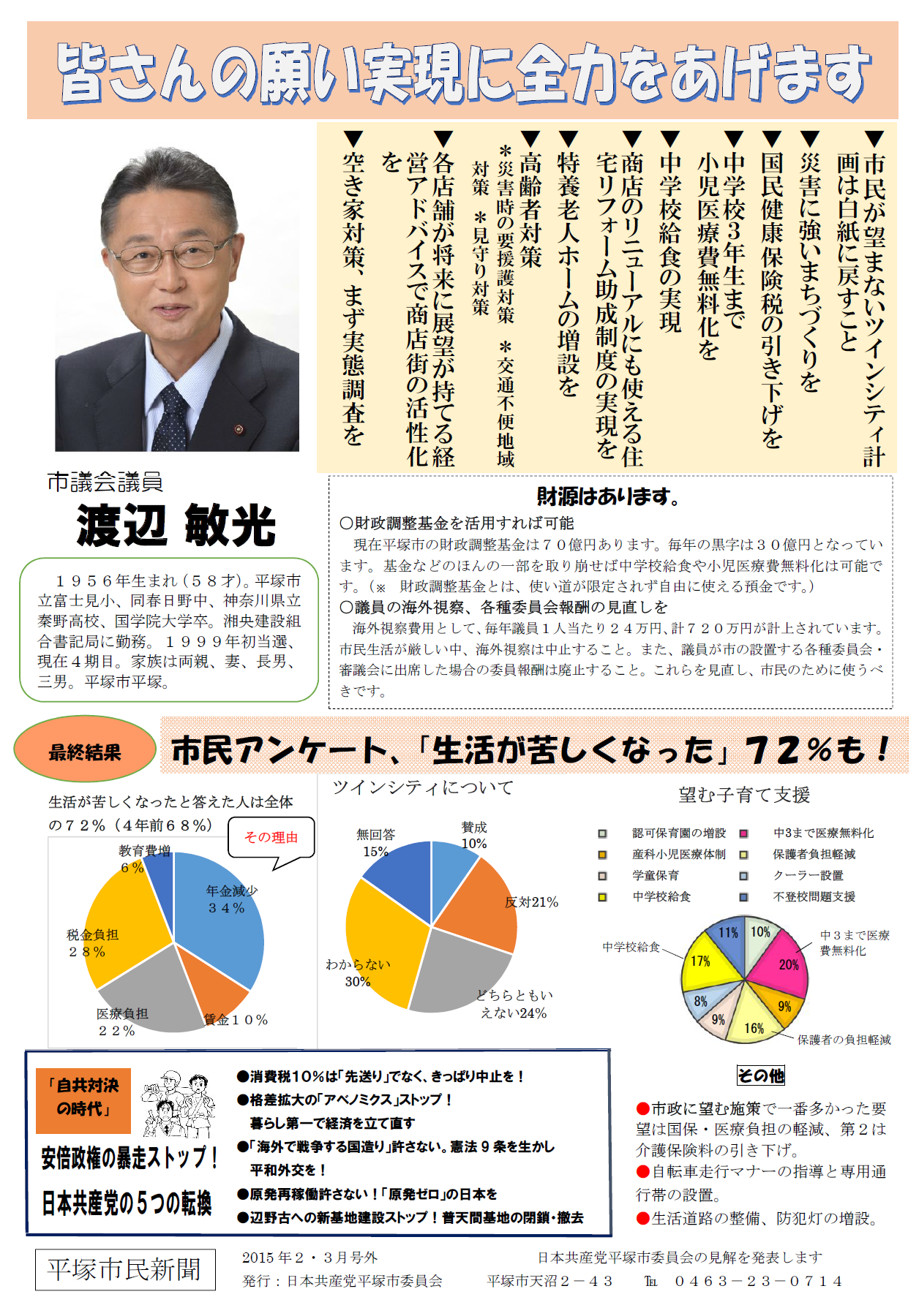 今回、議員3人(高山・渡辺・松本)の名前で政策を発表しました。市内全域にアンケートをお配りし、皆さんの要求を伺い、このたび、皆さんからお寄せいただいたご意見をまとめ、私たちの政策にもりこみました。