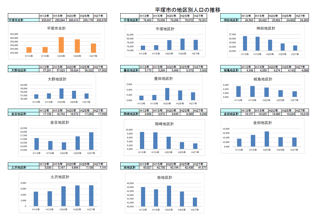 平塚市の人口は、多くの自治体同様わずかずつですが、減少傾向に向かっています。このグラフは平成13年から27年までの約15年間を5本の線で表してみました。