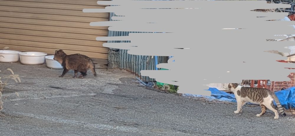 猫に混じって当たり前のようにエサを食べにくる狸。猫も全く排除する気配なし。のどかな時間です・・・。
