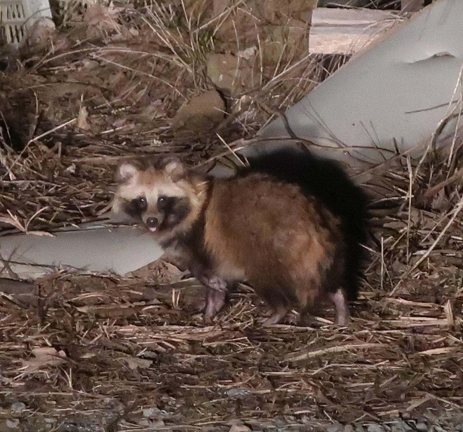 3mほどの距離で話しかけても「なに?」と立ち止まってじっと私を見ている狸。狸と私の腹の探り合い・・。