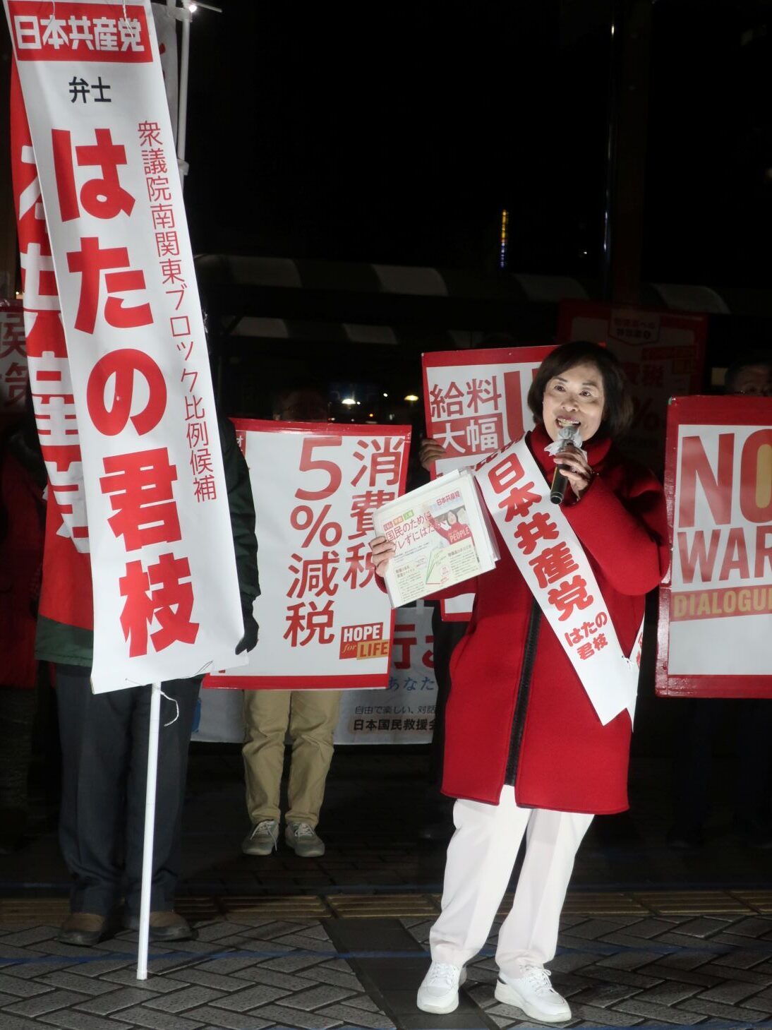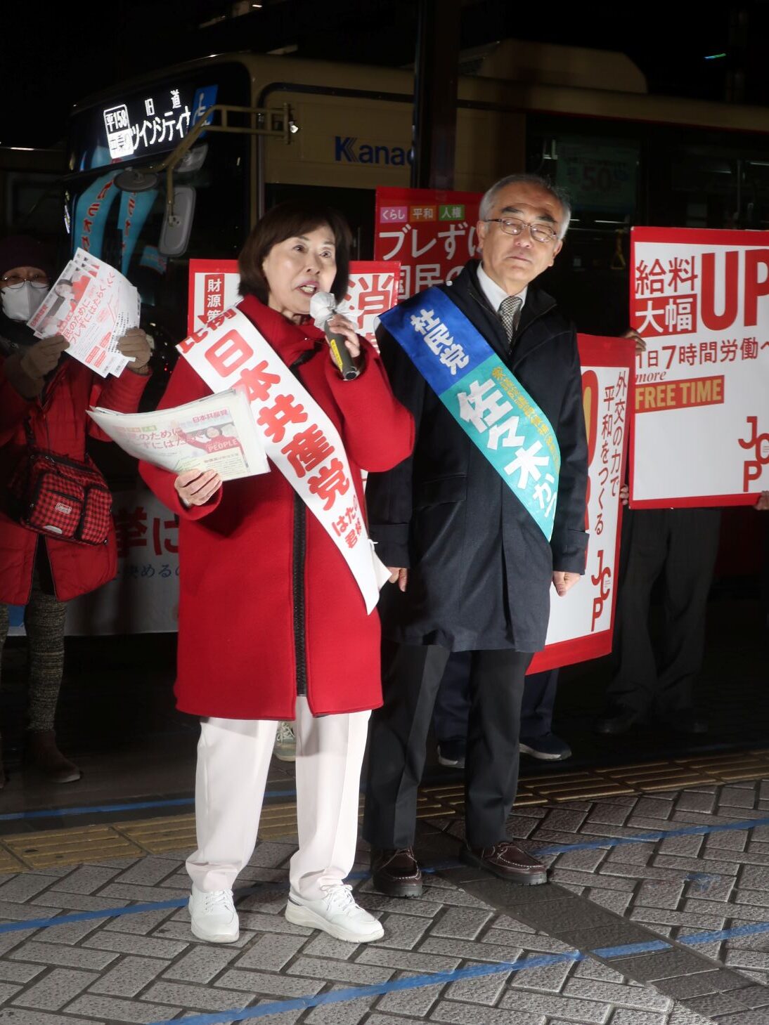 昨日(3日)は、夕方5時から8時まで平塚駅頭で日本共産党南関東ブロック比例代表・畑野君枝候補、15区候補・社民党の佐々木克己候補がそろって、買い物帰りの方や学生さん、仕事帰りの方々にご支持の訴えをしました。