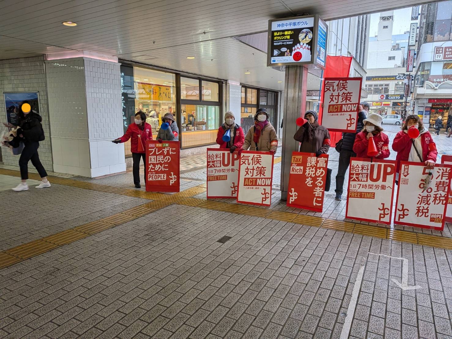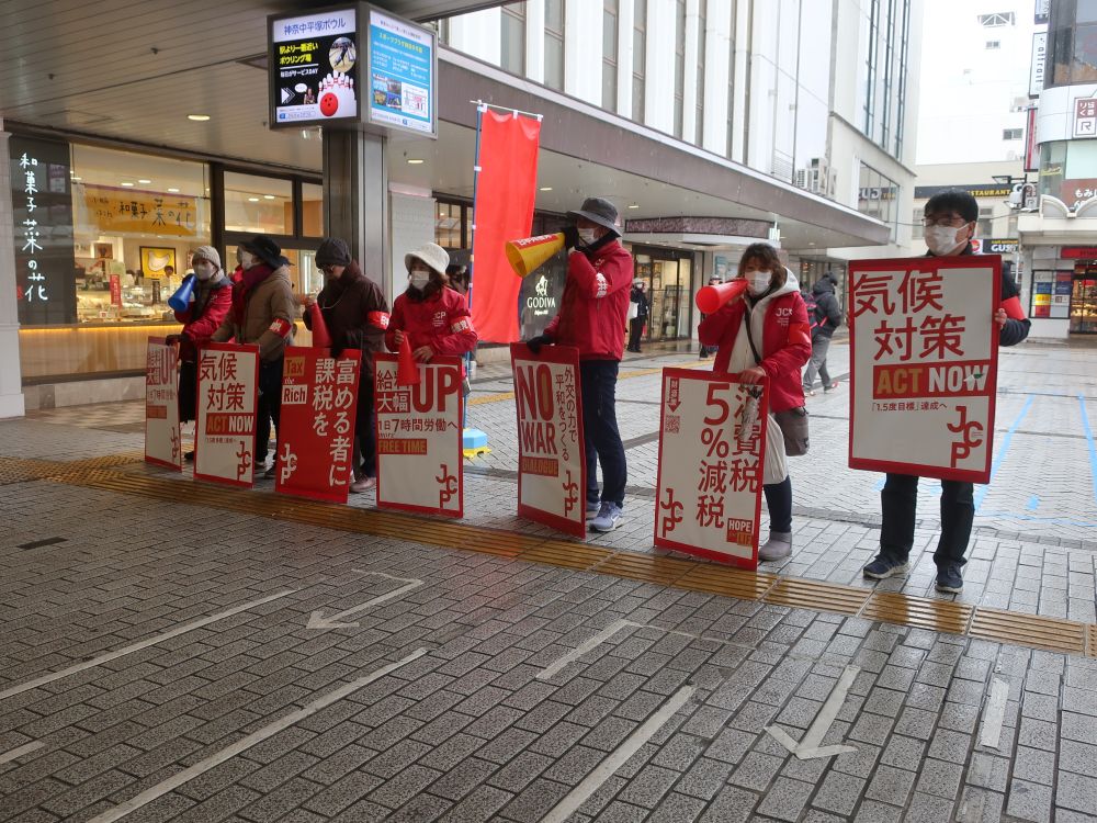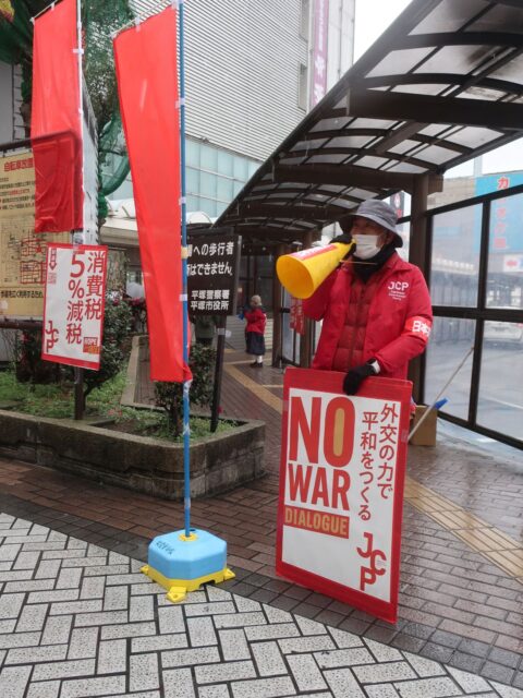 冷たい雪が舞う駅頭でしたが、赤いジャンバーでプラスターをもって「比例は日本共産党!」「富める者に課税を!」「戦争の準備より平和の準備を! 日本共産党」と呼びかけました。