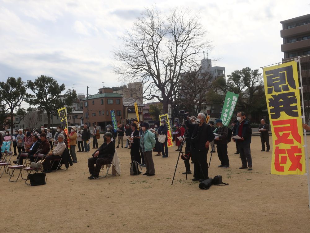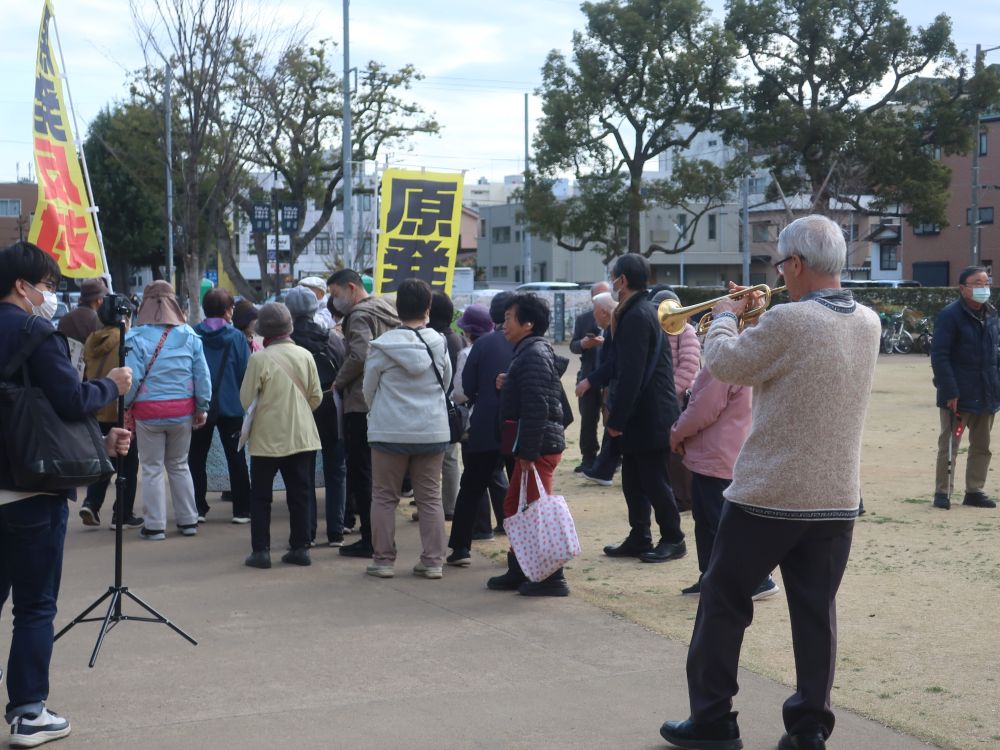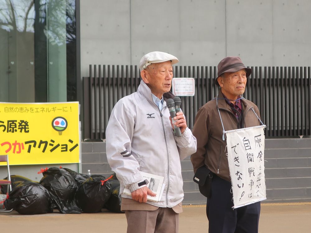 7日(土)は「さよなら原発 ひらつかアクション」が行われました。素晴らしい天気に恵まれ、実行委員長の平野さんの進行で、この「さよなら原発」の生みの親:井上駿さん、原発の現場で働いていた小倉志郎さん、都合で参加できなかった大藏律子元市長のメッセージ、学生の深江さん、「第4の被曝」で亡くなられた永野さんの娘さんからの訴え、亀組のパントマイム、市議・町議のリレートーク、2時46分の黙とうと続き、その後松平晃さんのトランペットで送り出していただき、文化芸術ホール前の見附台公園から平塚駅までシュプレヒコールをしながら行進しました。