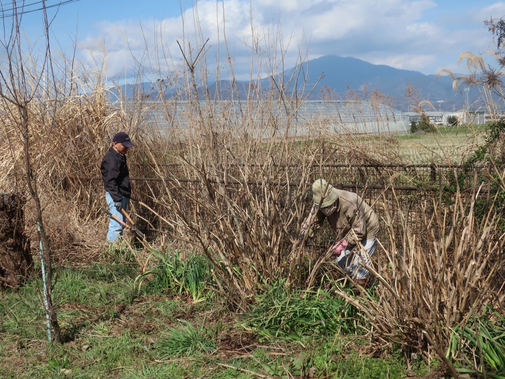 7日(土)は早朝配達の後、地域の「花の会」で花菜ガーデン周辺のアジサイの枝の剪定作業を行いました。