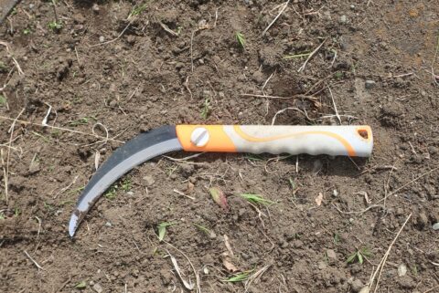 根っこが張って固い萱の種類の草のため、今回で3本目のノコギリ鎌を買いました。