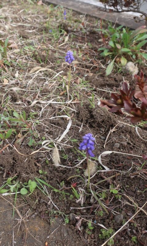 草で隠れていた水仙やムスカリが顔を出し、少々恥ずかしそう・・。